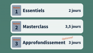 Les Essentiels, un module exclusif : bénéficiez d’un premier module supplémentaire développé par Anne Mathieu et moi-même. Ces 2 jours forment une mise à niveau pour intégrer au mieux tous les éléments de la Masterclass.